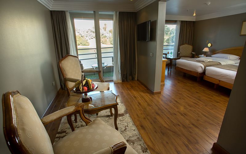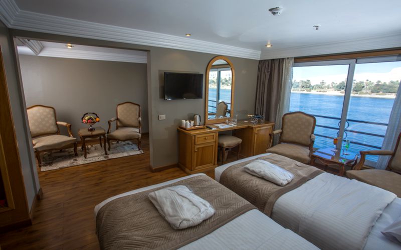 All cabins feature large panoramic windows that can be opened, offering uninterrupted views of the Nile’s changing scenery.