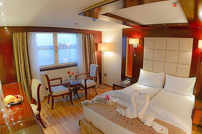 All cabins include large panoramic windows, allowing uninterrupted views of the Nile while sailing.