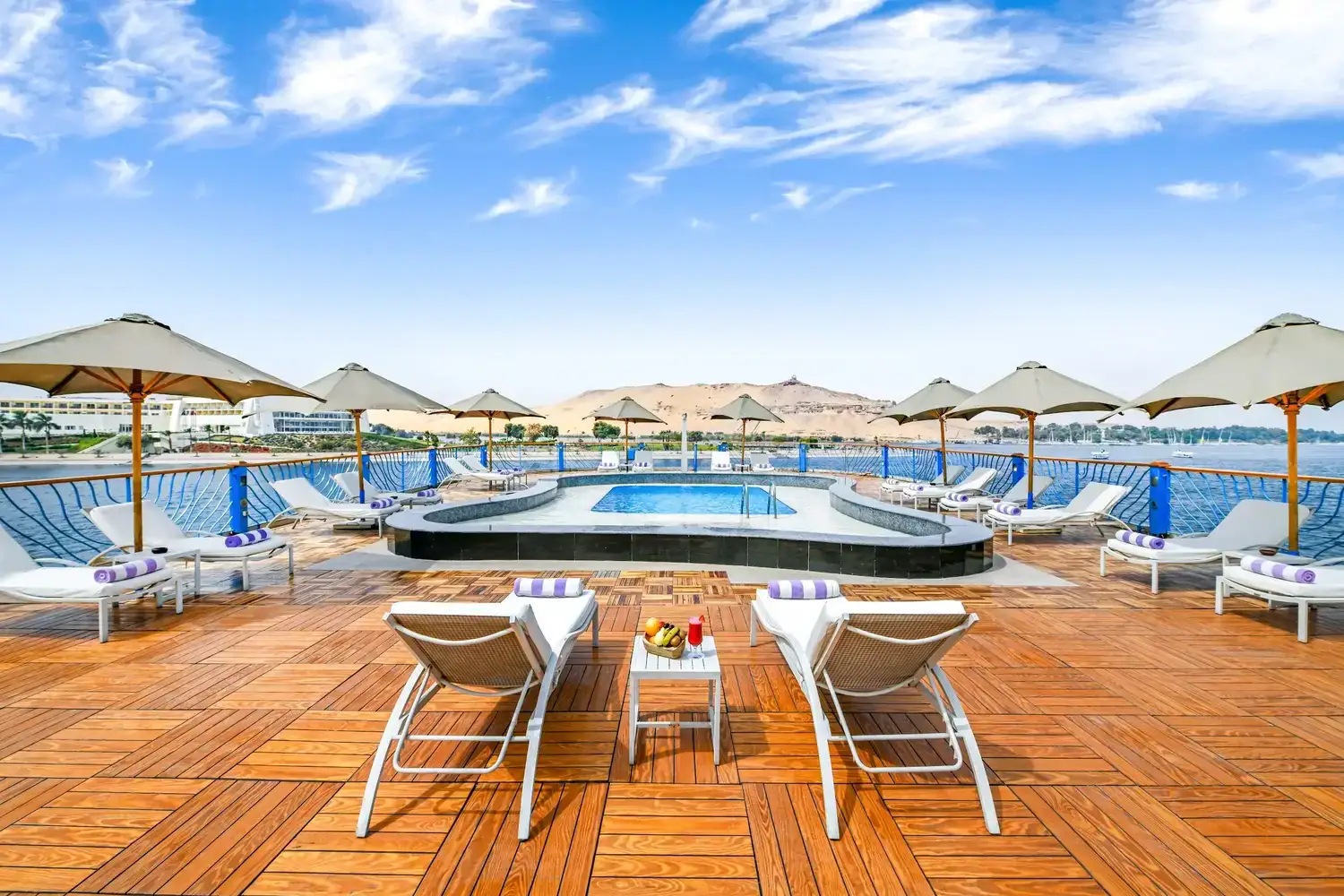 Sailing between Luxor and Aswan, the H/S Kon Tiki Nile Cruise is a deluxe-class vessel offering a comfortable and engaging way to explore Egypt’s ancient wonders. With 70 cabins, including standard cabins, suites, and panoramic suites, the ship accommodates up to 150 guests, making it larger and more social than boutique luxury options.