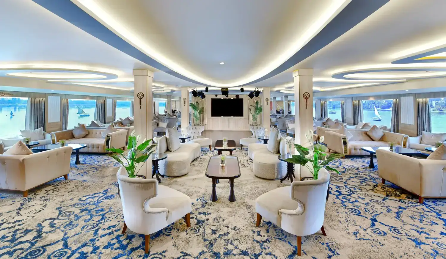 The design blends modern elegance with classic Egyptian touches, creating a welcoming and relaxed atmosphere onboard. Guests can explore legendary sites such as Karnak Temple, Edfu, Kom Ombo, and Philae, while enjoying full-board dining, guided tours, and a wide range of onboard facilities.