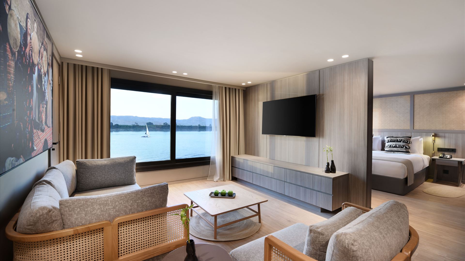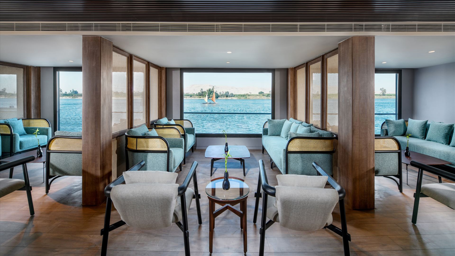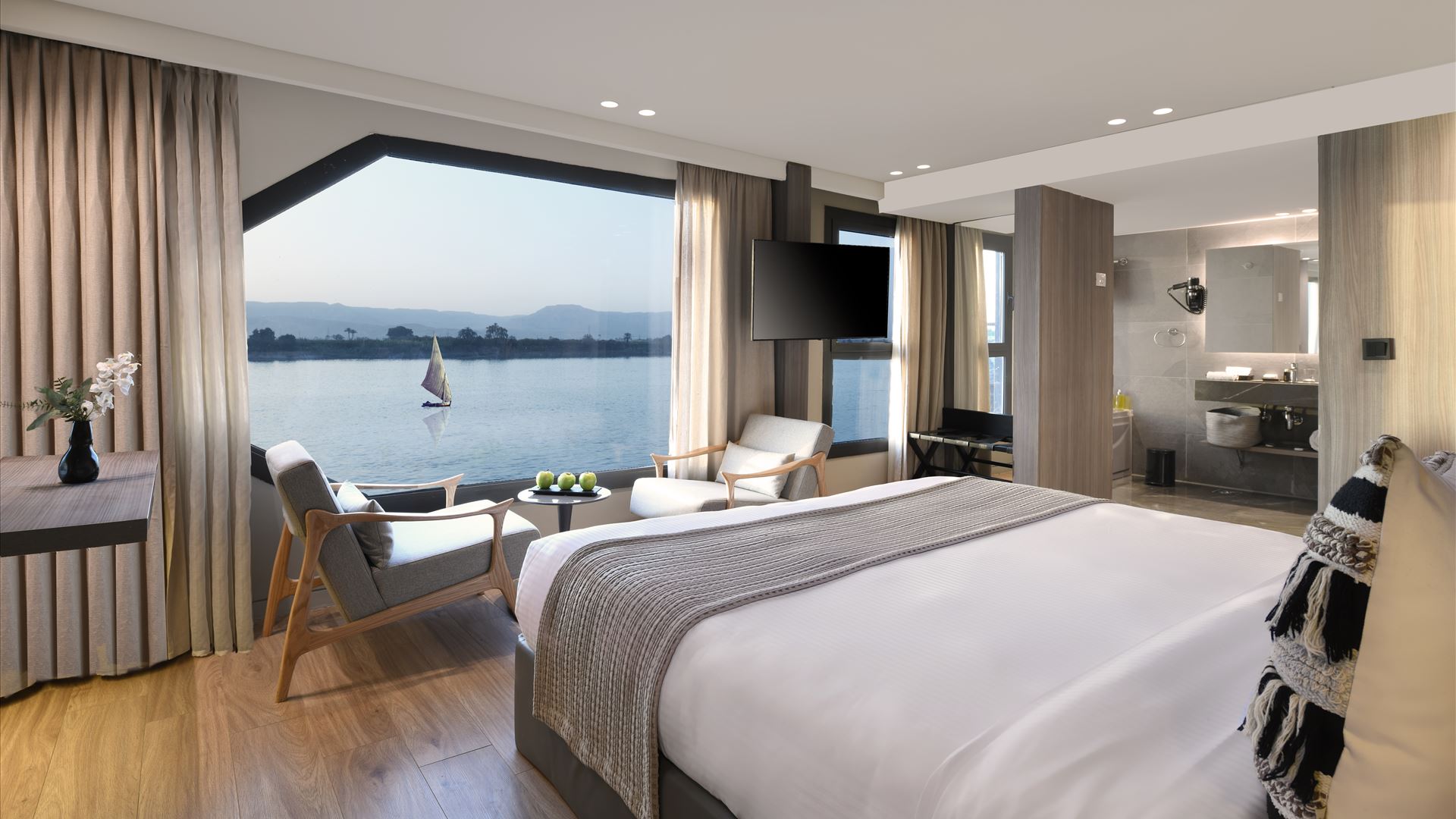 All rooms feature large panoramic windows that keep you connected to the Nile scenery at all times.