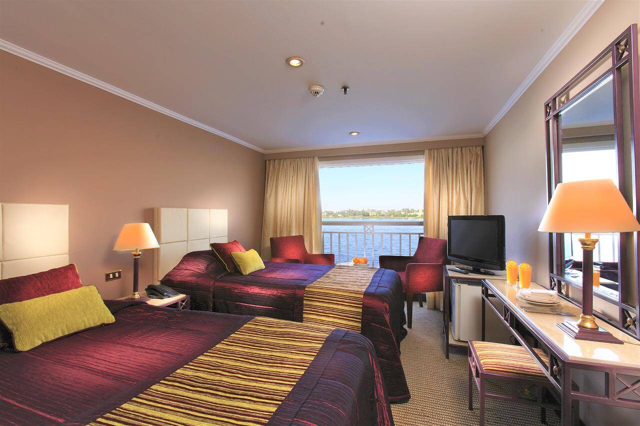 All cabins feature large panoramic windows, allowing natural light and uninterrupted Nile views throughout the cruise.