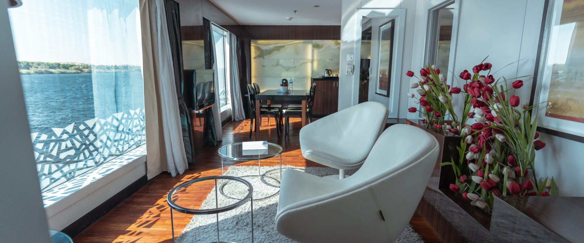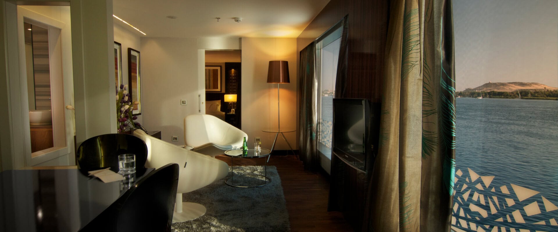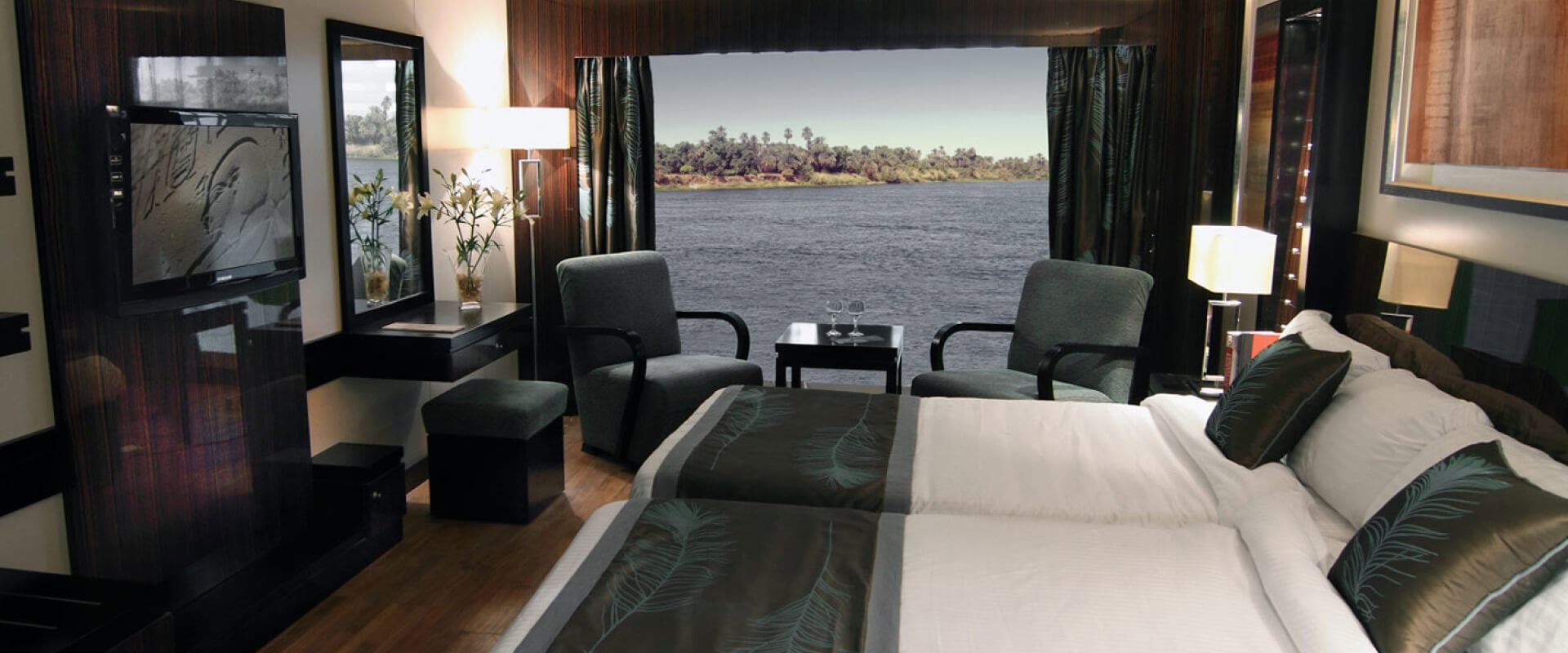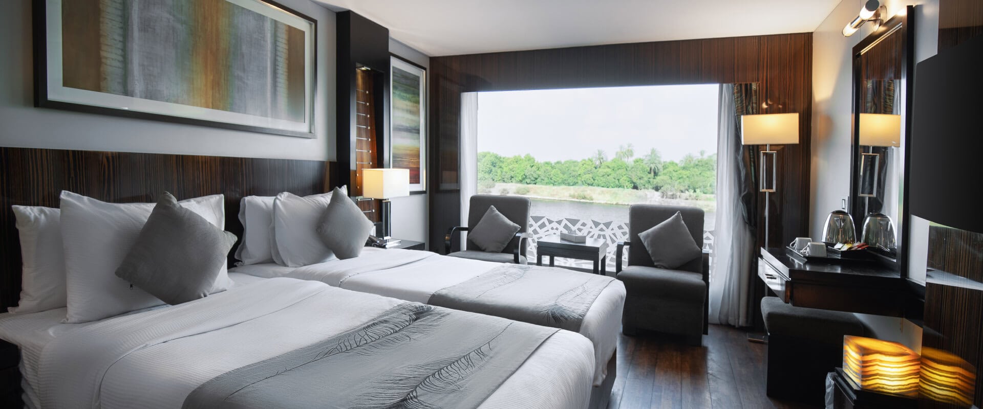 All accommodations feature floor-to-ceiling panoramic windows, flooding rooms with natural light and uninterrupted Nile views.