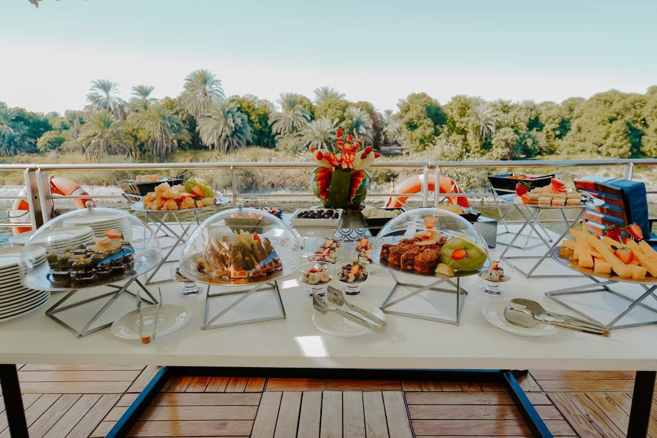 The ship features an elegant, spacious restaurant with panoramic Nile views. Dining is conducted in a single seating format, fostering a relaxed yet refined atmosphere. Meals blend Egyptian specialties with international favorites, prepared by experienced onboard chefs.