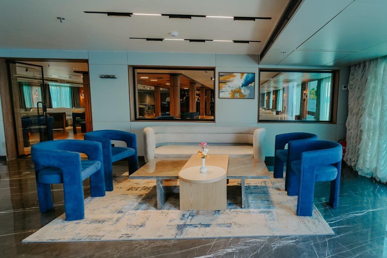 Its design draws inspiration from ancient Egypt, combining royal blue tones with soft light-brown hues reminiscent of temple stonework—creating a calm, elegant onboard atmosphere that complements the landscapes drifting by outside.