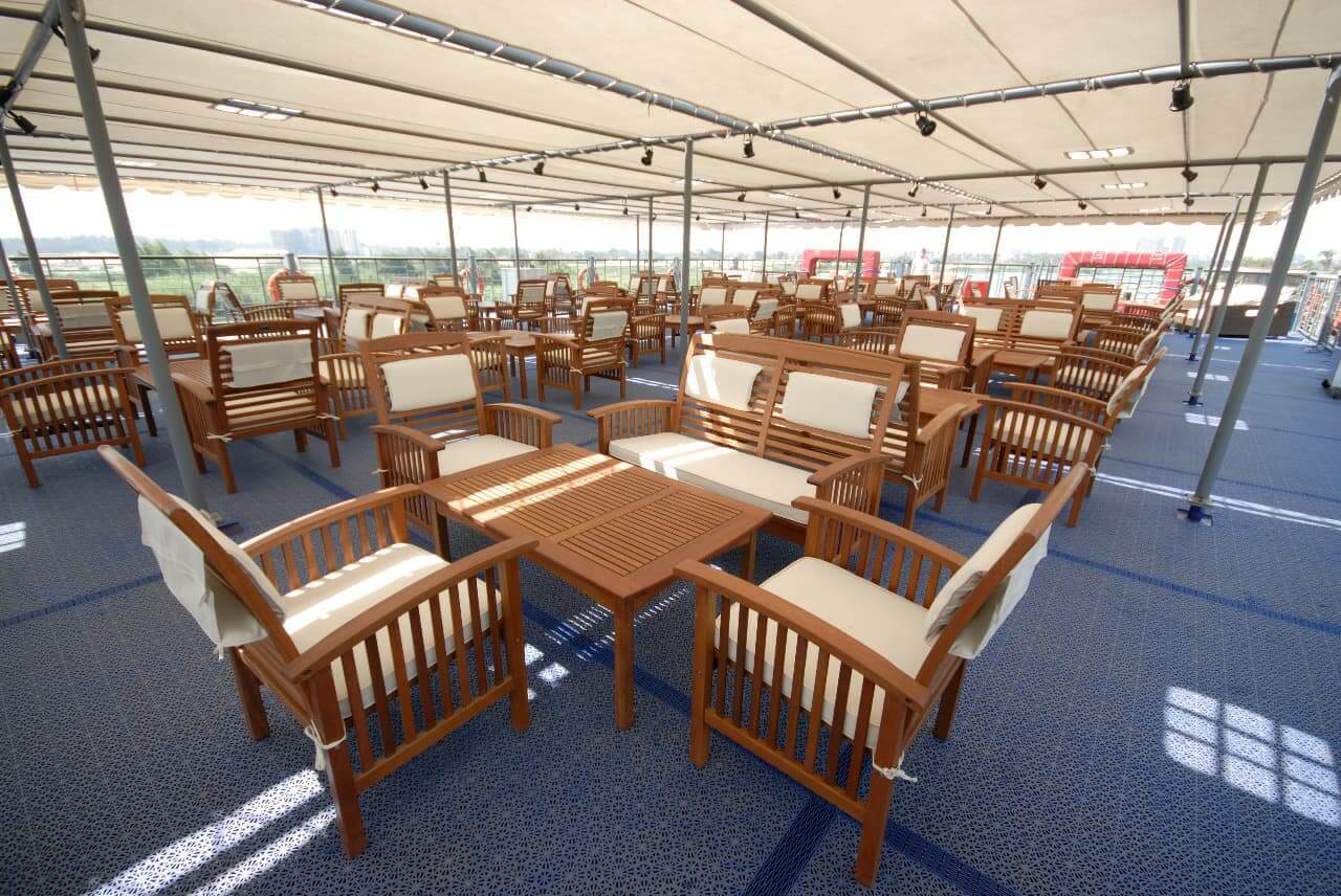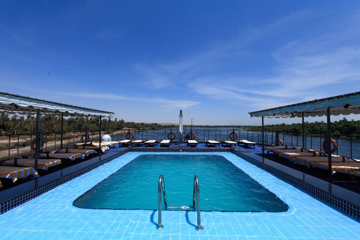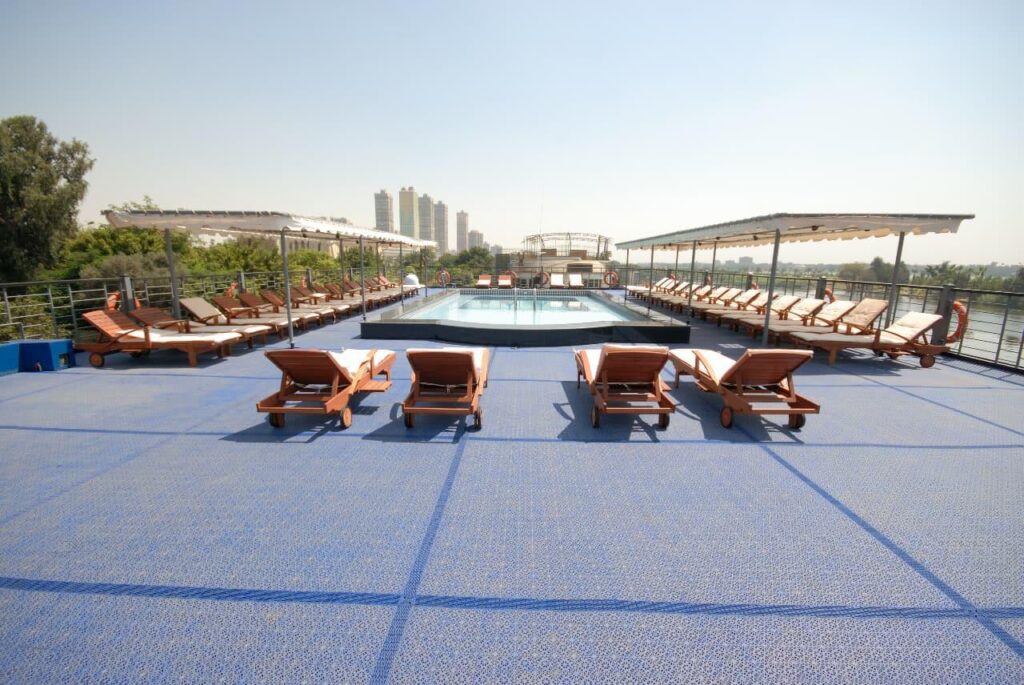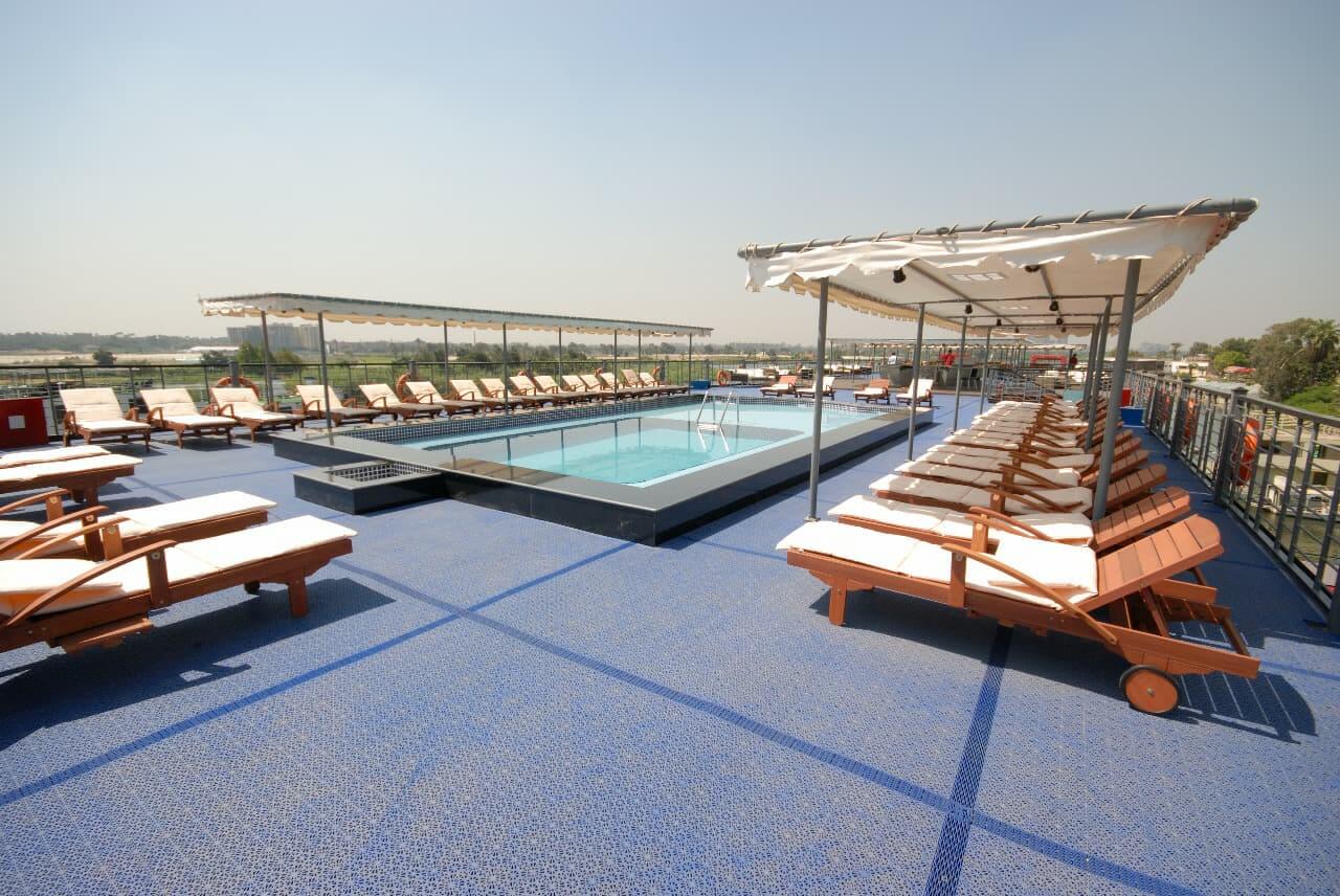 A highlight of the ship, offering a swimming pool, pool bar, sun loungers, and shaded seating. Ideal for relaxing between excursions while enjoying uninterrupted Nile views.