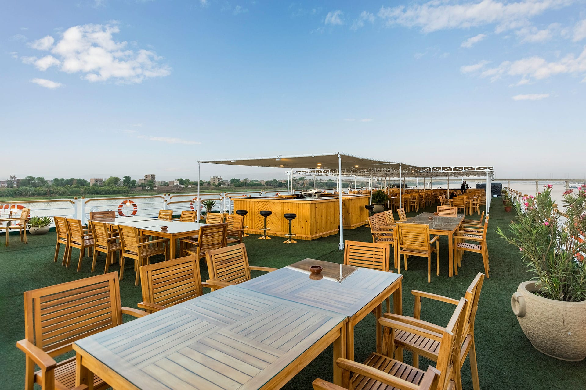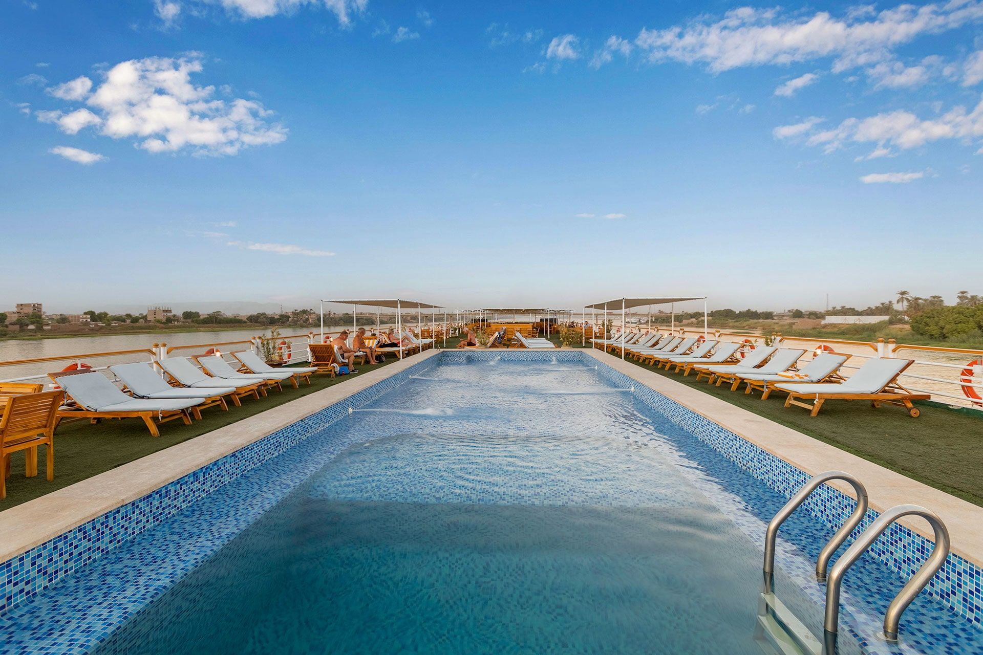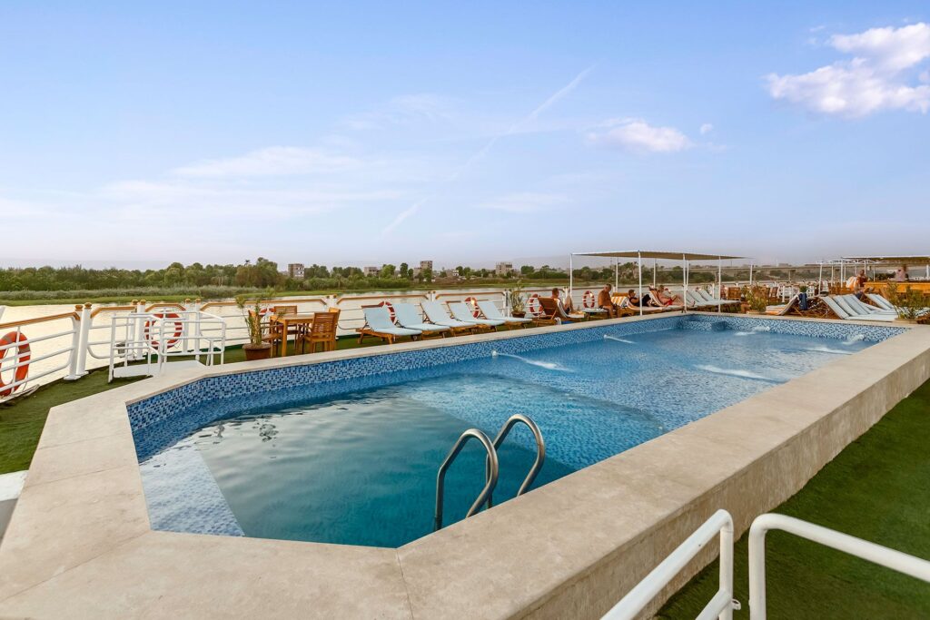 A highlight of the ship, equipped with a swimming pool, sun loungers, shaded seating, bar service, and barbecue area—ideal for relaxing while watching the Nile scenery drift by.