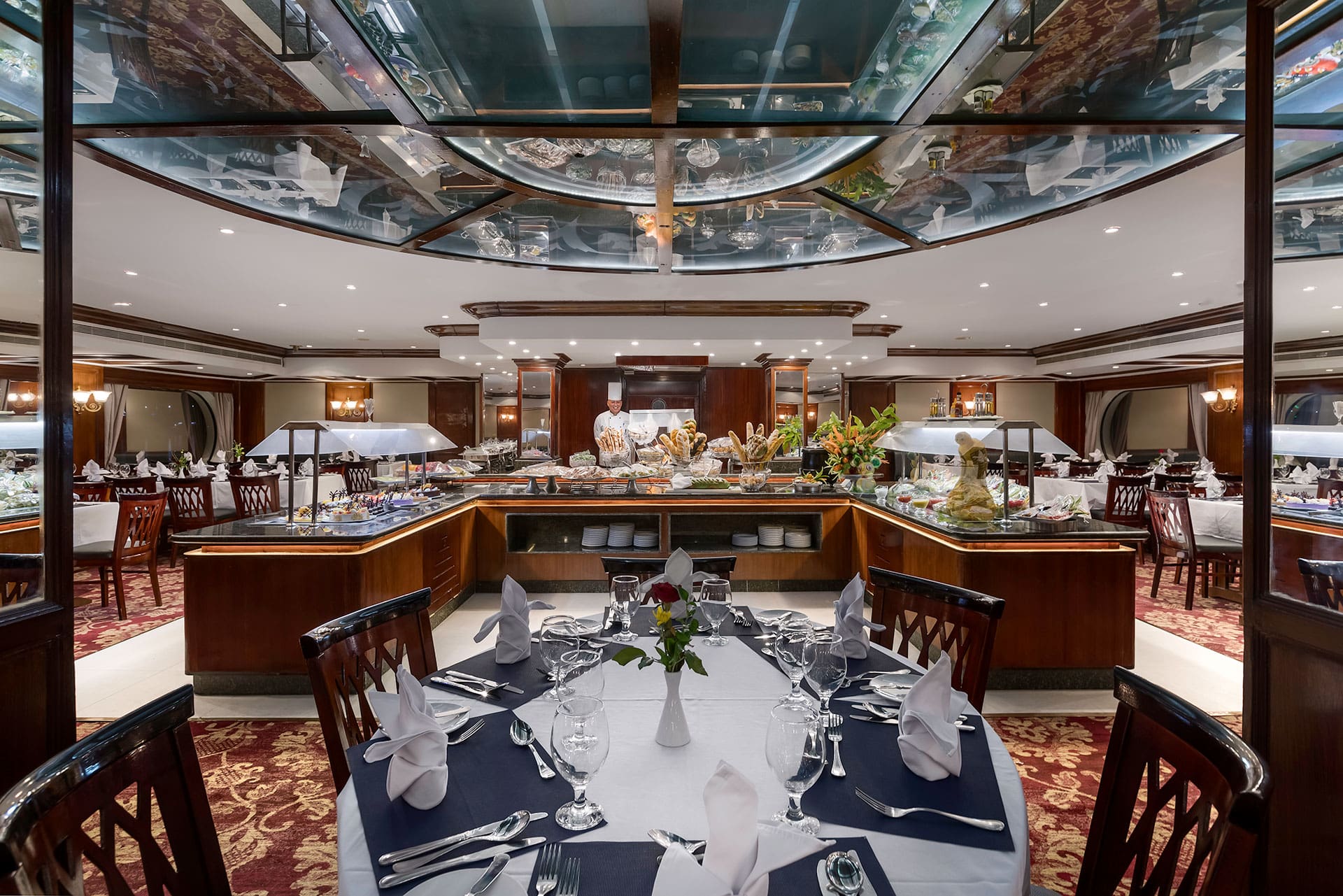 Expect a varied buffet featuring grilled meats, fresh vegetables, salads, soups, desserts, and vegetarian options. Special theme nights and oriental dinners add variety to the experience.