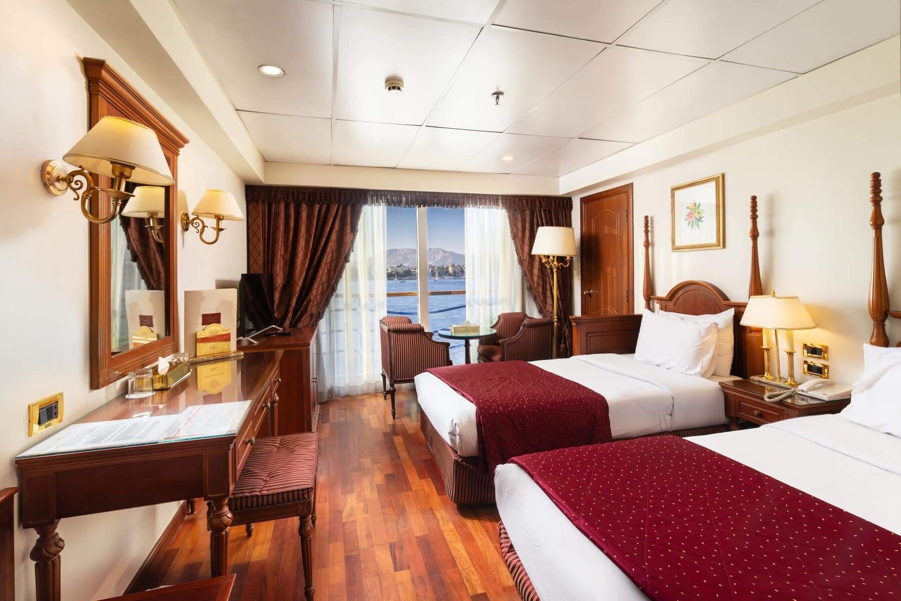 Cabins feature classic furnishings with neutral tones, designed for comfort and relaxation after long sightseeing days. Large windows ensure constant Nile views.