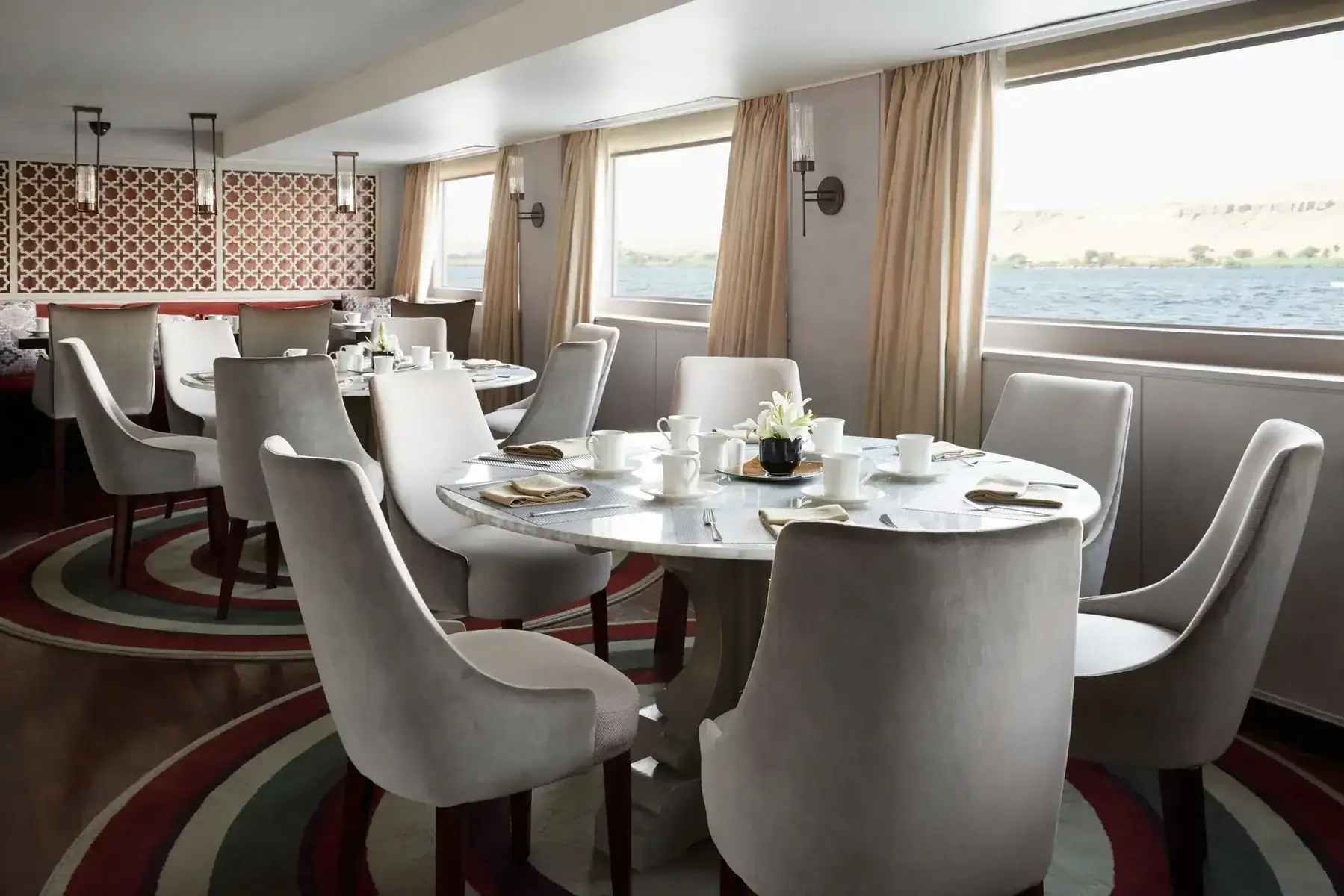 Restaurant with panoramic Nile views, reception area, boutique shop, and elegant lounge spaces designed for relaxation and socializing.