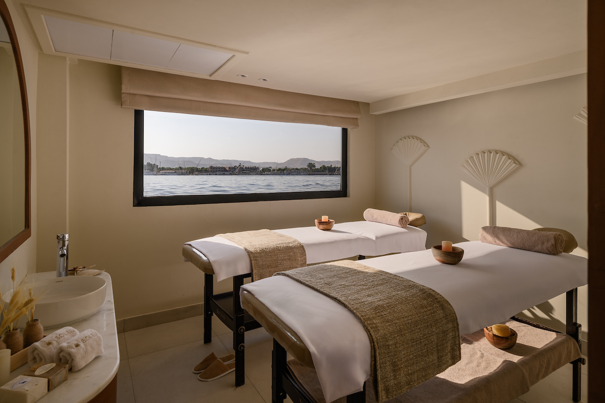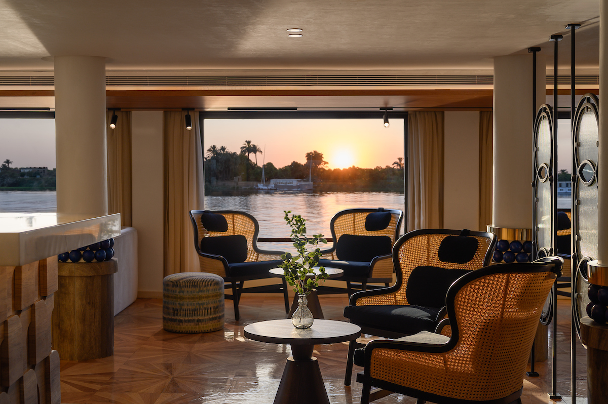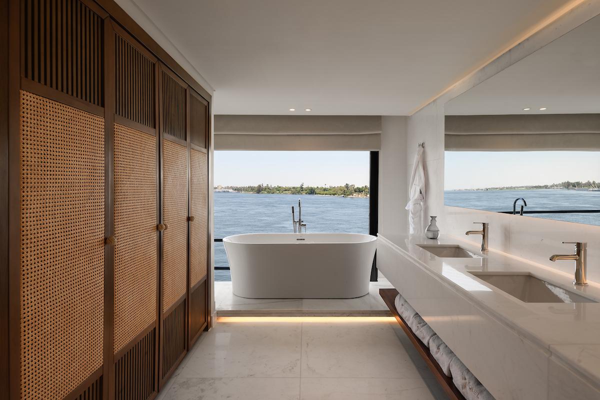 All rooms and suites feature private floor-to-ceiling balconies, offering uninterrupted Nile views. Large glass panels allow natural light to flood the space, turning each cabin into a front-row seat to the passing landscapes.