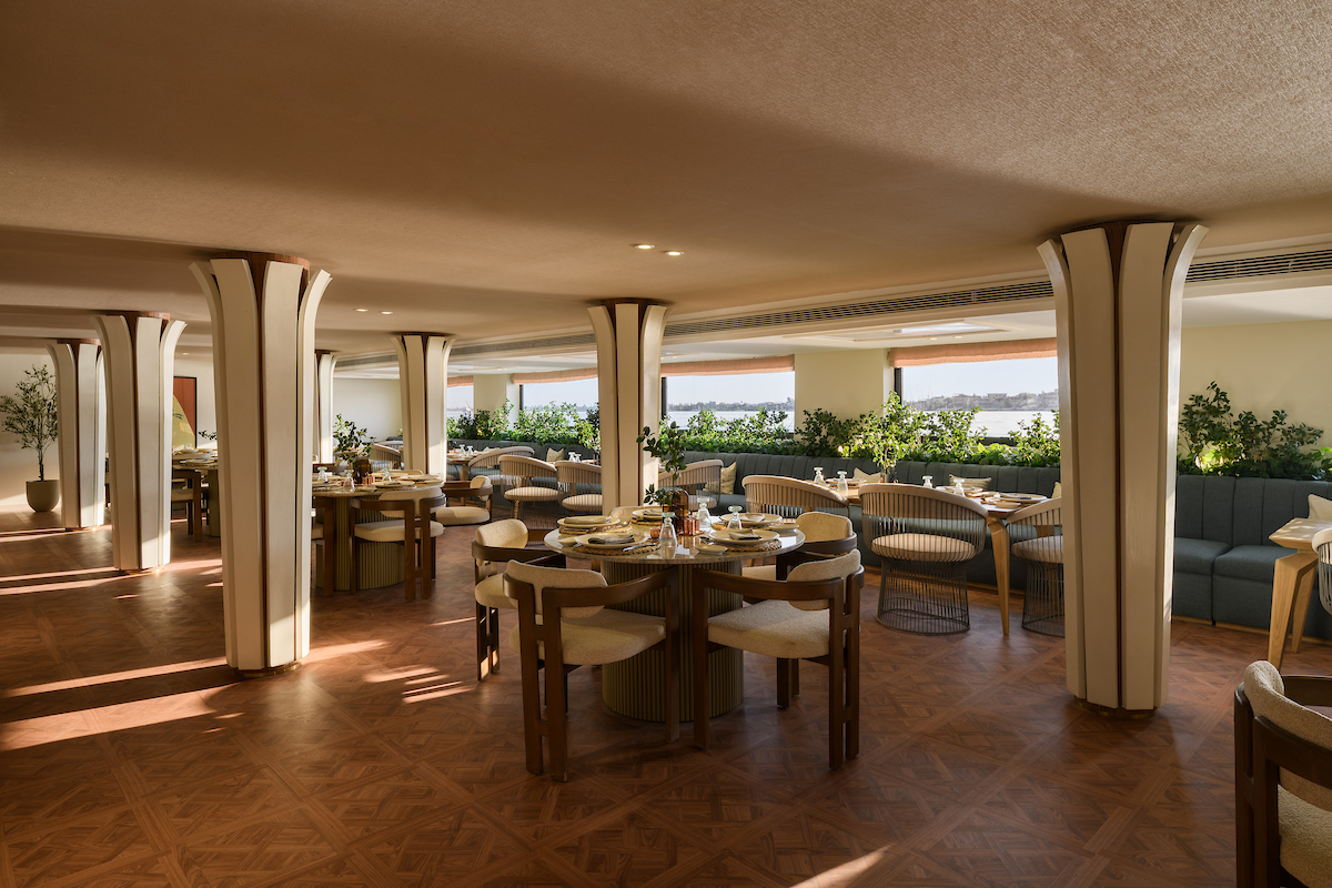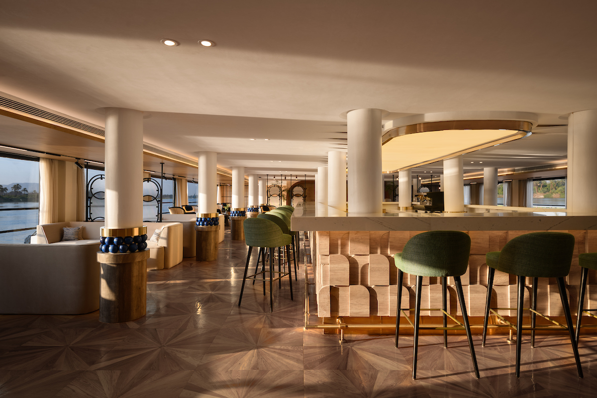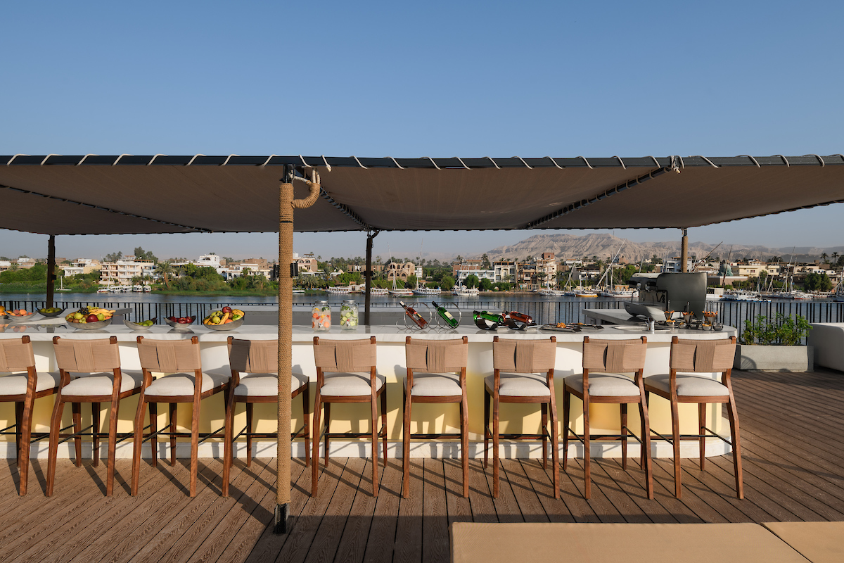 The sundeck offers panoramic Nile views in a sleek, elegant setting. Open all day, guests can relax by the pool, enjoy cocktails and meals, or unwind under the stars with expertly crafted drinks.
