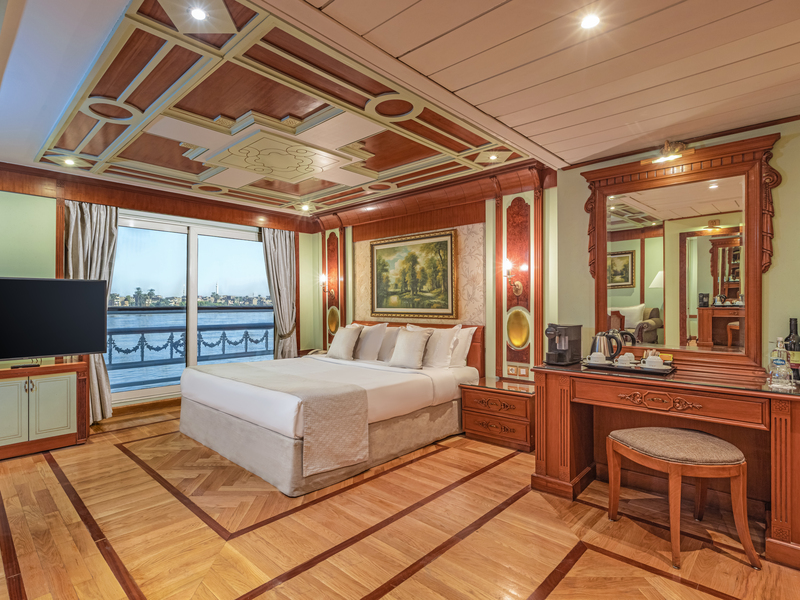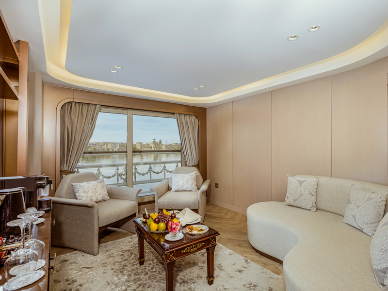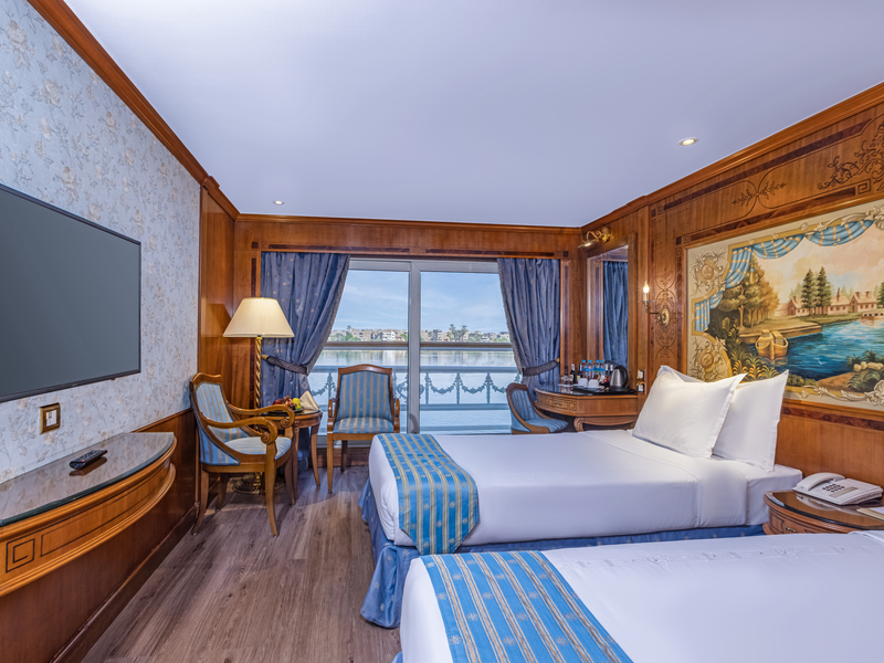 All accommodations feature double-glass panoramic French windows that open, allowing fresh Nile breezes and uninterrupted river views.
