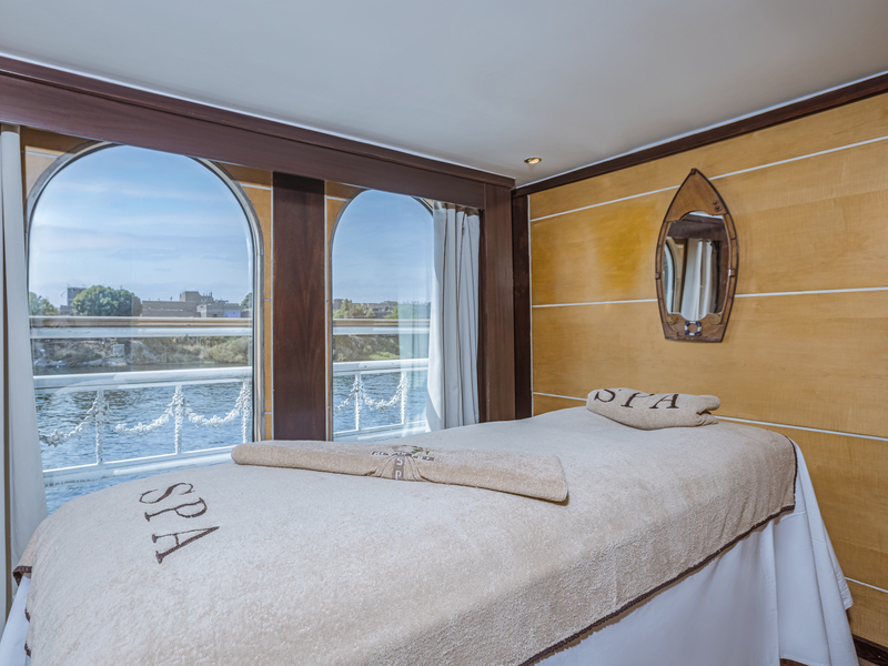 Bathrooms are a standout feature, equipped with spa units including steam bath, Jacuzzi, and water massage, offering a rare level of luxury for a Nile cruise.