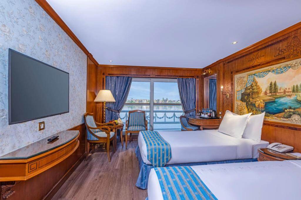 All cabins include double-glass panoramic French windows, allowing uninterrupted Nile views and natural light.