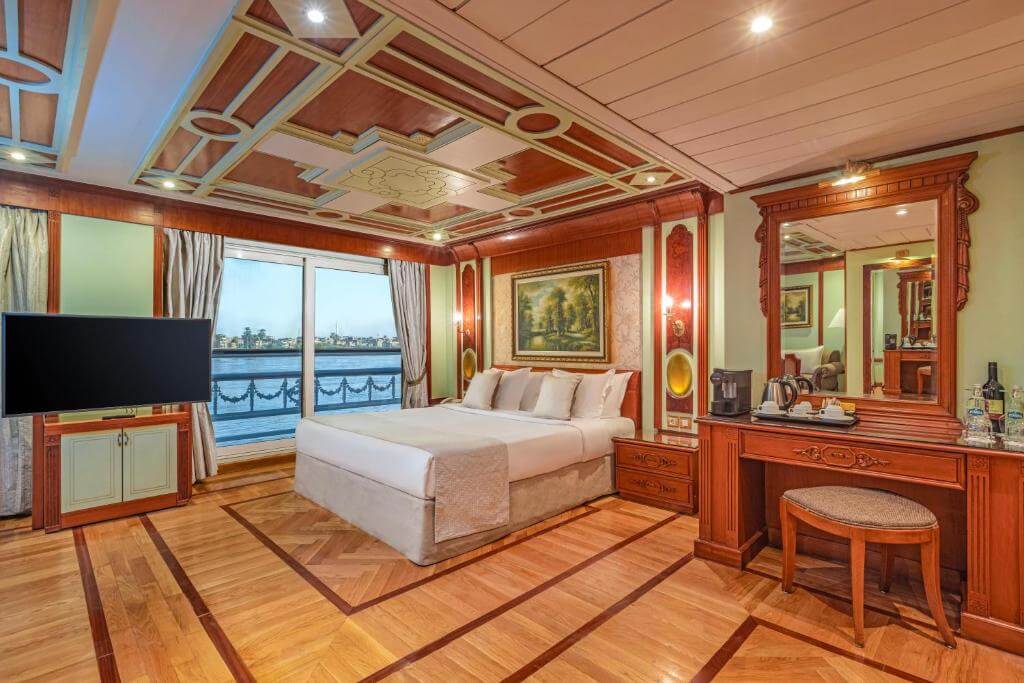 Cabins are designed with a blend of classic European luxury and Egyptian influence, featuring wood paneling, elegant fabrics, and refined finishes.