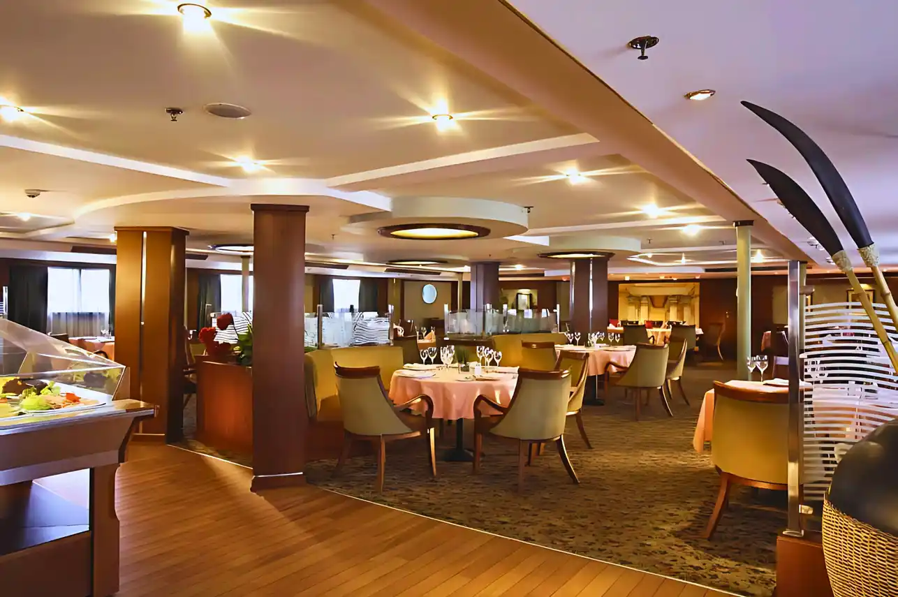Meals are served in the Main Dining Room, offering breakfast and lunch buffets and à la carte dinners. When guest numbers are low, lunch is served à la carte, enhancing the dining experience.