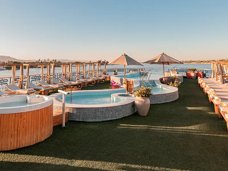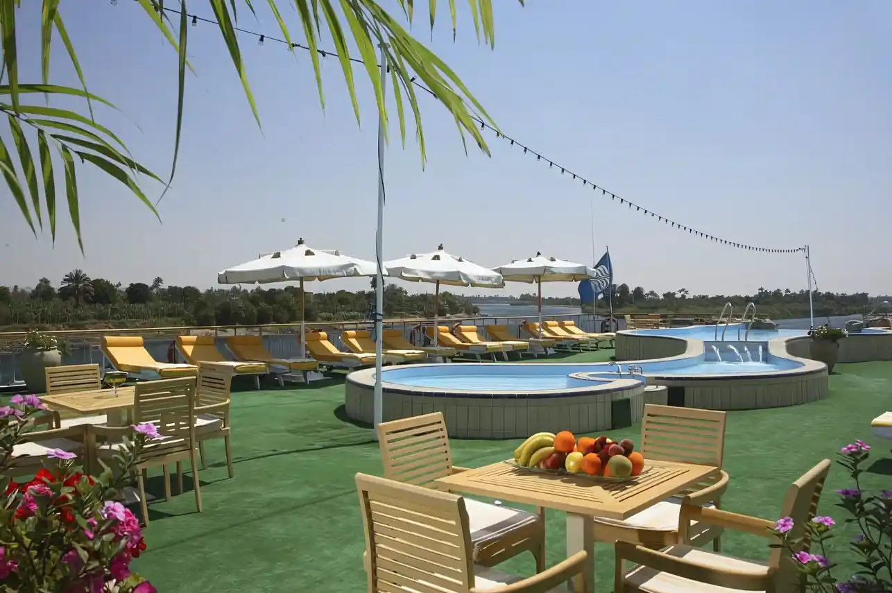 A highlight of the ship, featuring a swimming pool, jacuzzi, sun loungers, shaded seating areas, and a sun deck bar. The barbecue lounge hosts casual outdoor dining and evening relaxation with panoramic Nile views.