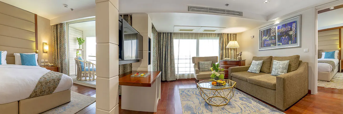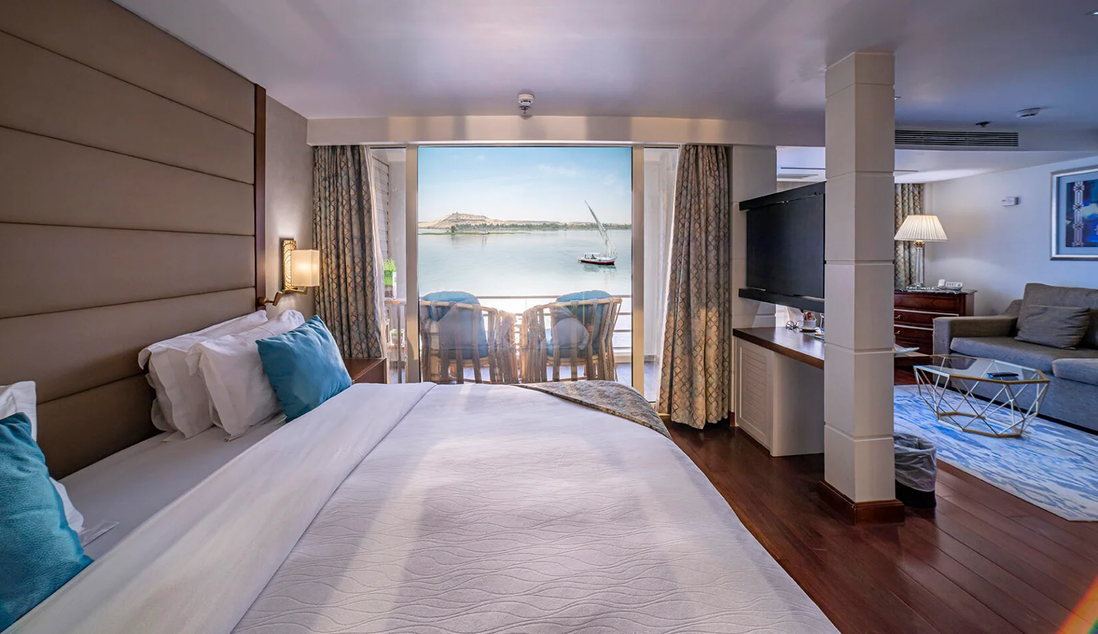 Every suite has a private balcony, allowing guests to enjoy uninterrupted Nile views from their own outdoor seating area.