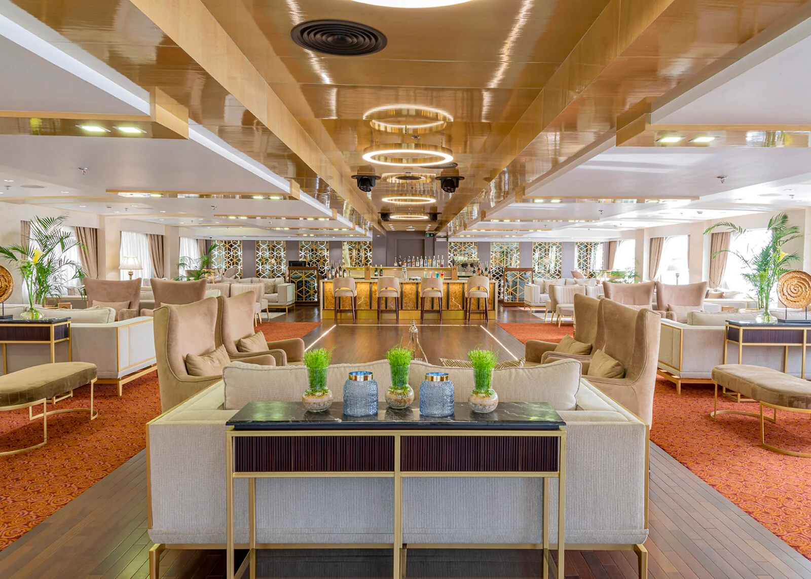 The ship is designed for comfort and flow, with spacious indoor lounges, elegant dining areas, and wide outdoor decks.
