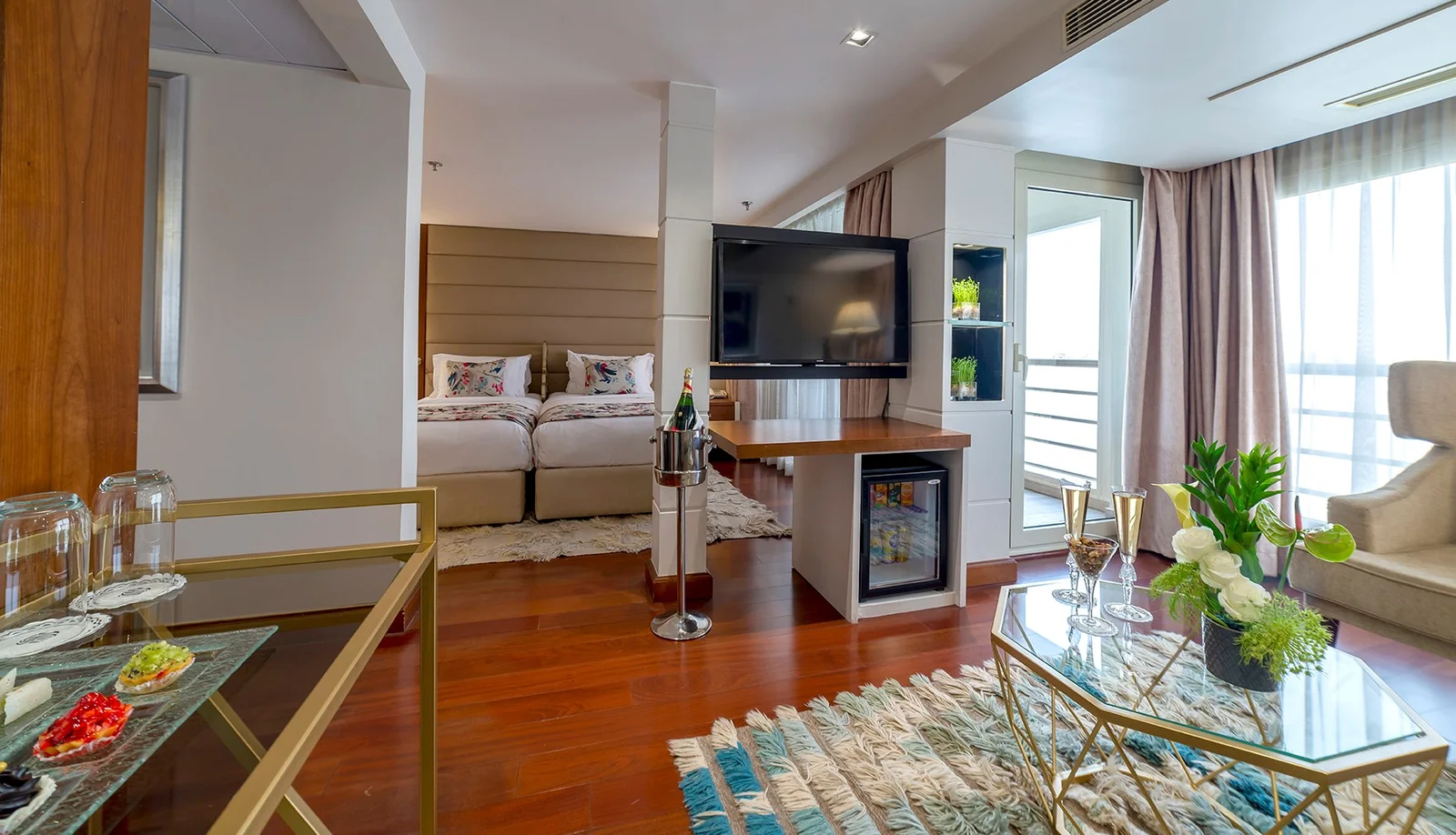 All suites are modern, bright, and tastefully furnished with warm colors, premium fabrics, and large sliding doors opening to private terraces.