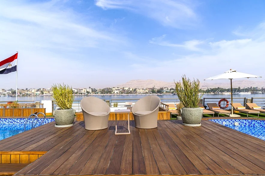 Features a swimming pool, Jacuzzi, sun loungers, jogging track, barbecue area, and sundeck bar—ideal for relaxing while sailing the Nile.