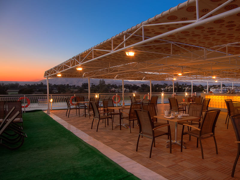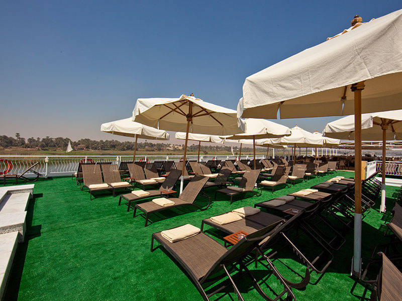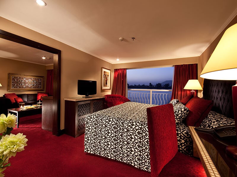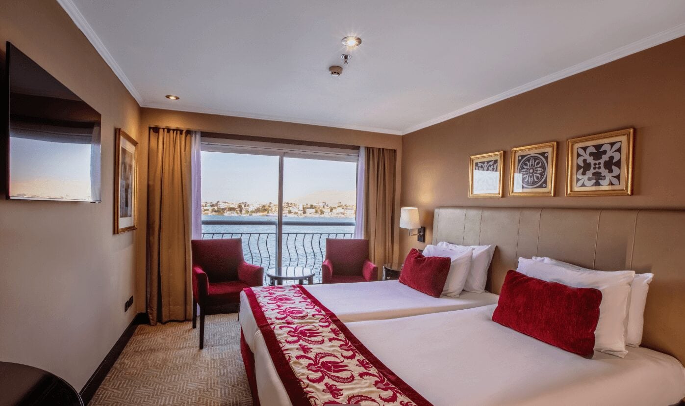 All cabins include large sliding windows. Cabins on the main and upper decks also feature private balconies, allowing guests to enjoy the Nile directly from their room.