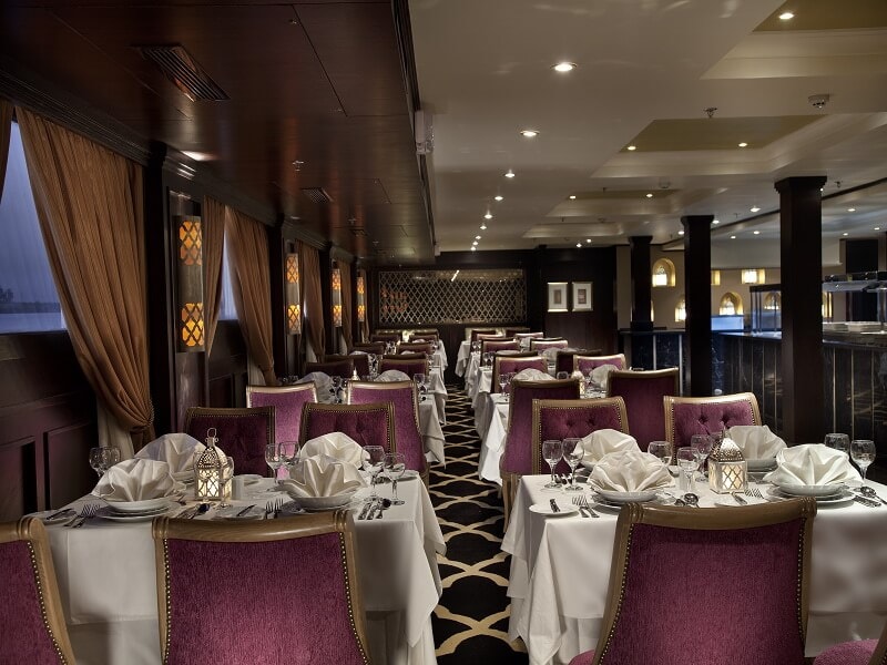 All meals are served in the main onboard restaurant, offering a mix of international cuisine and authentic Egyptian flavors.