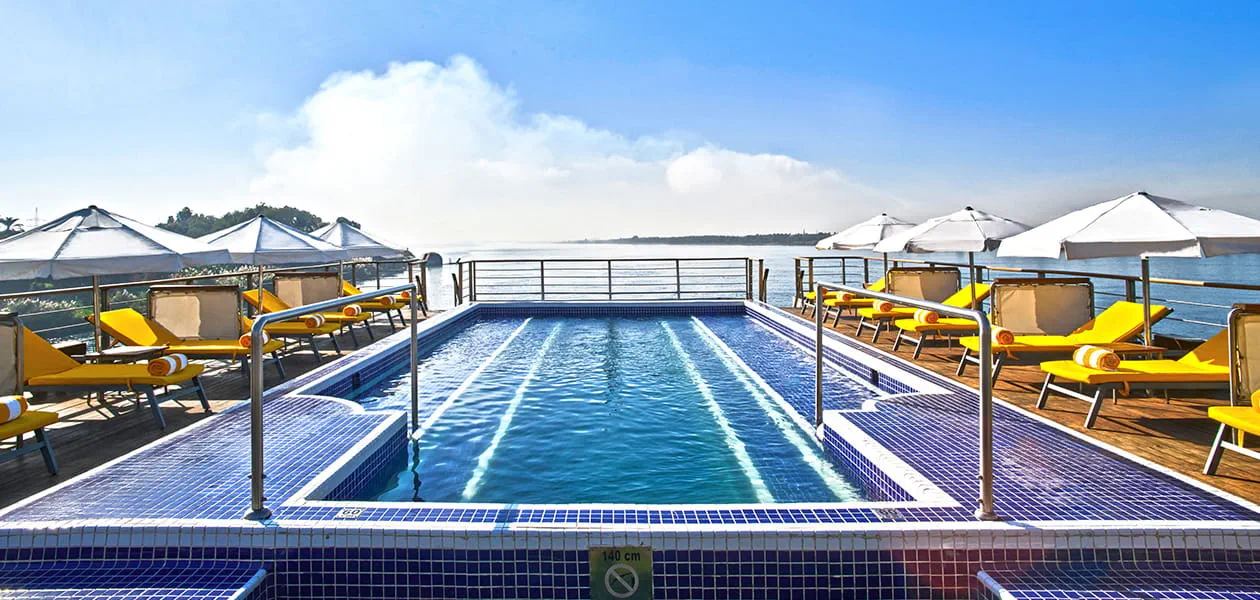 Temperature-controlled upper deck pool with loungers, drinks, and snacks, offering relaxing Nile views.
