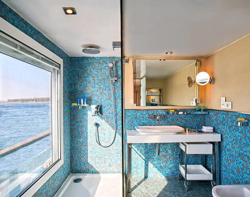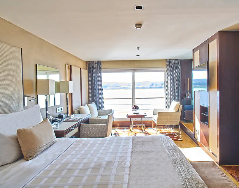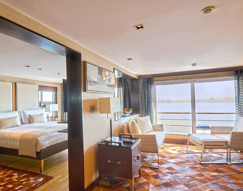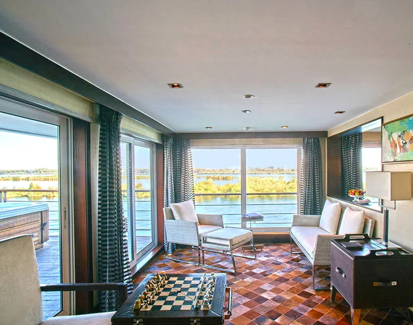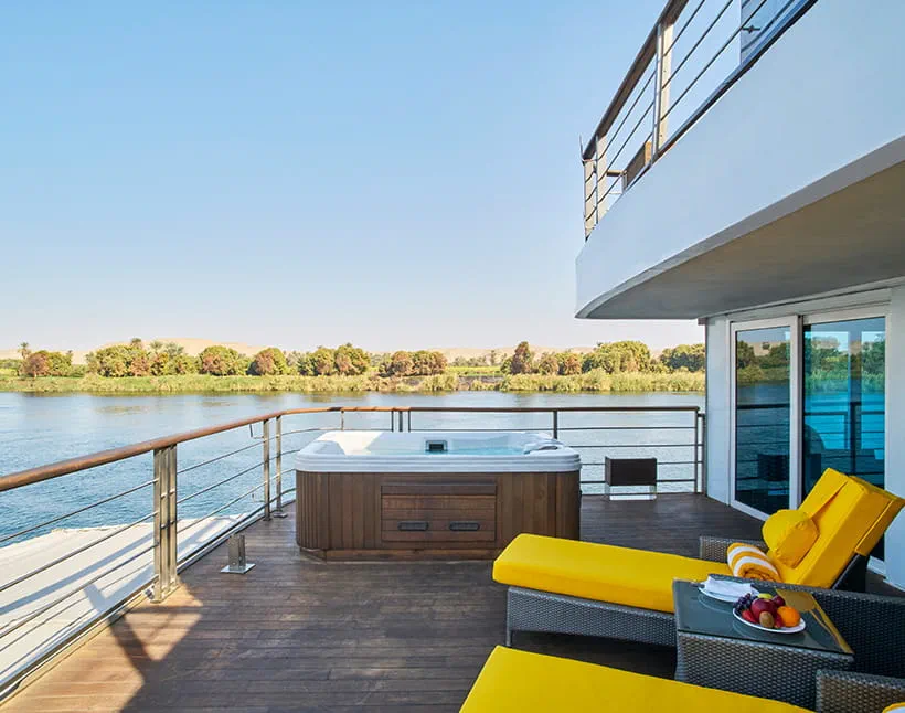 Each cabin and suite blends modern elegance with comfort, featuring clean lines, natural fabrics, and tasteful Egyptian-inspired décor. Large windows frame stunning Nile views, creating a relaxing and inviting atmosphere. Luxury Suites with Terrace include a private outdoor whirlpool for a truly indulgent experience.