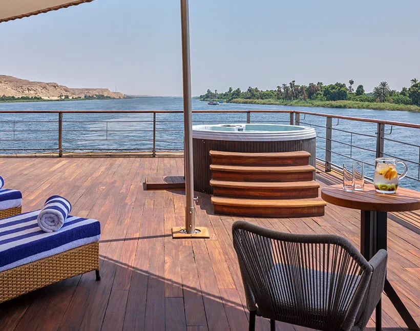 All cabins feature floor-to-ceiling panoramic windows, while suites offer private terraces and outdoor whirlpools for a true open-air Nile experience.