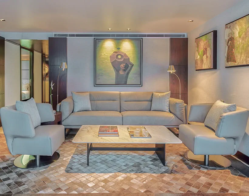 Modern and elegant, with a natural color palette, clean lines, and large windows that keep the Nile always in view.