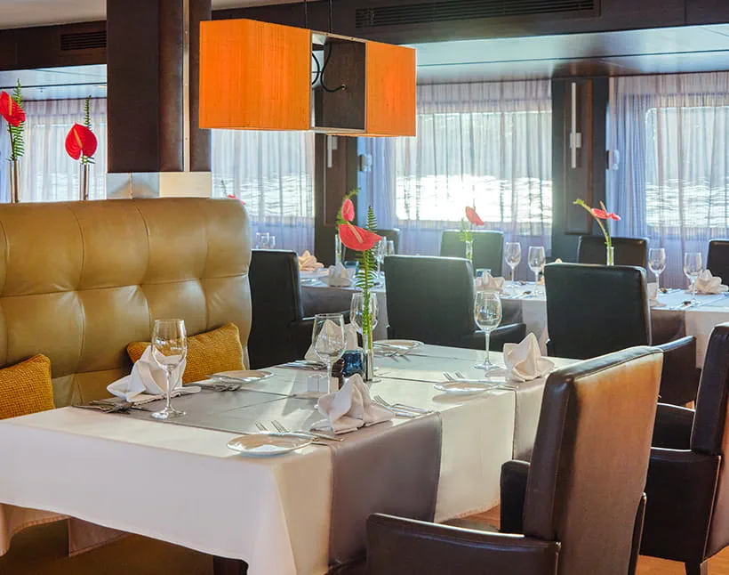 Light meals, snacks, and drinks are available on the sun deck under shaded canopies, perfect for relaxed daytime dining or romantic evenings.