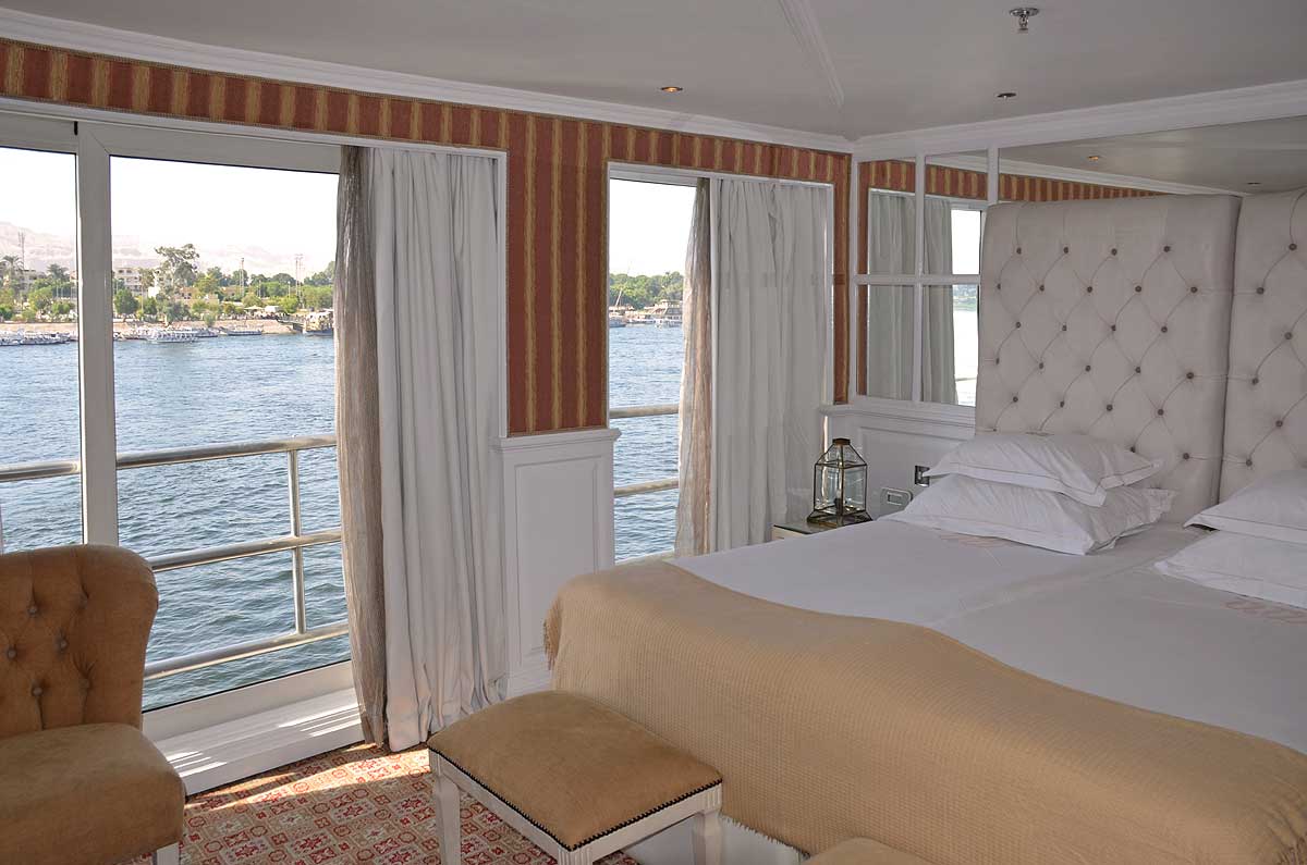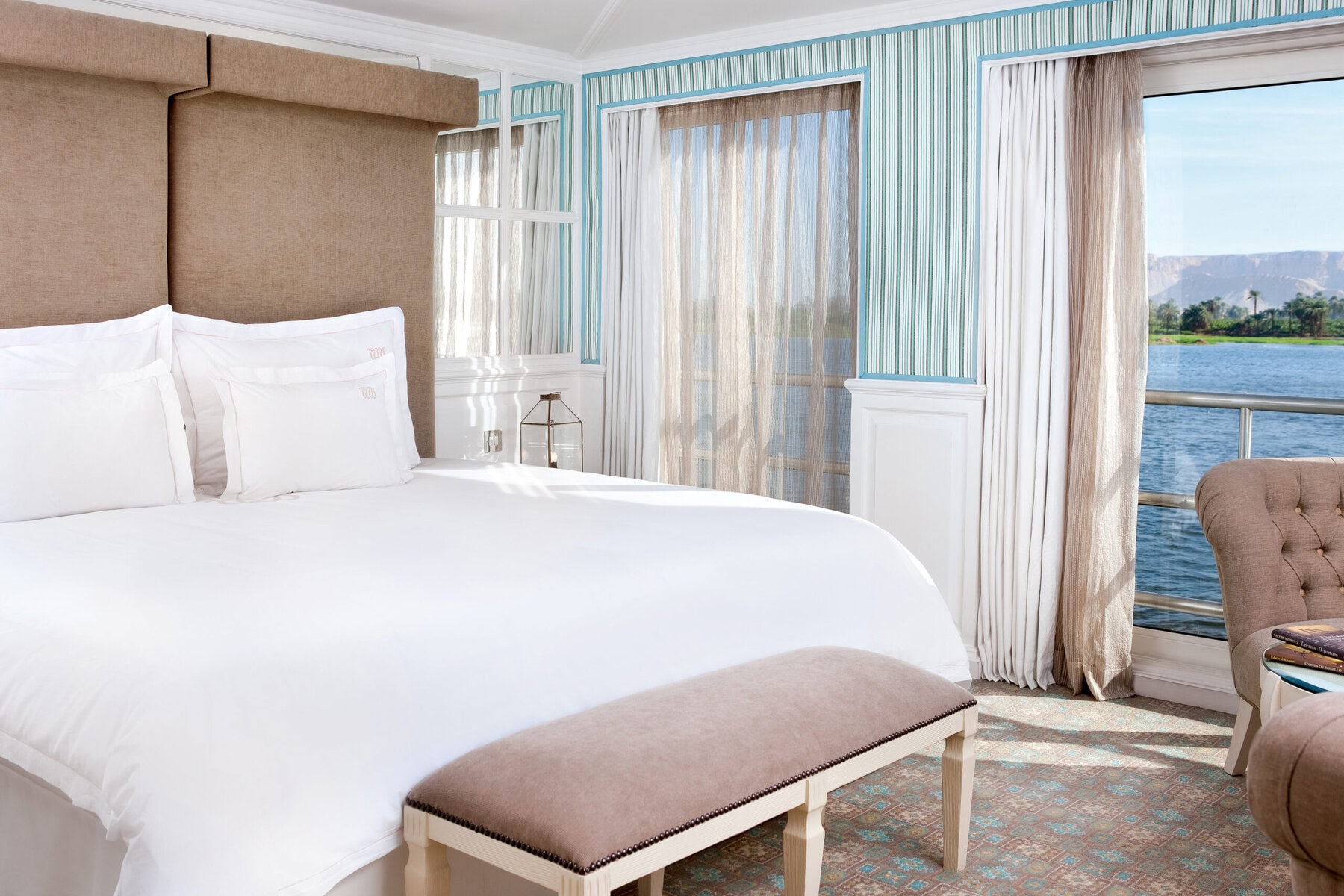 Every suite enjoys uninterrupted Nile views, thanks to large panoramic windows and French balconies that flood rooms with natural light.